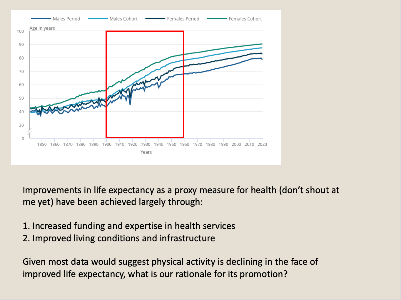 Another big change came in 1940s. After the second world war the UK embarked on its welfare state, including the National Health Service and increased funding focused on better health outcomes for the population. This investment was coupled with reforms that allowed cities and councils to improve their housing stock, improve sanitation, clear slums, and create new towns for a growing populace. Infrastructure, both improved housing and accessible green space, coupled with a welfare state, have, it would seem, done the most to improve life expectancy, at least in the UK. Physical activity has had a bit part role at best which challenges the long-held notion that it is a key component in maintaining and improving public health.